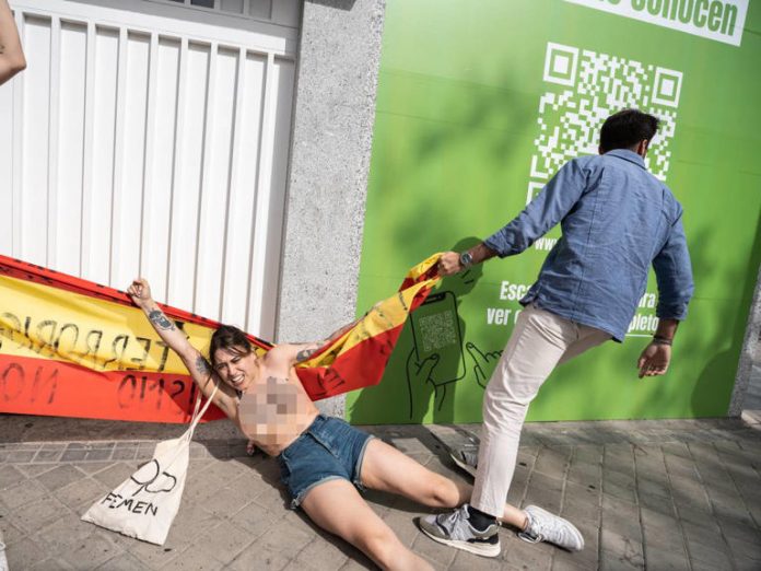 Una activista del grupo feminista Femen fue agredida al ser arrastrada por un simpatizante del partido de ultraderecha Vox mientras protestaban contra el “terrorismo machista” a las afueras de la sede el partido al norte de Madrid, tratándole de arrancar la pancarta para ingresar con su auto al edificio.