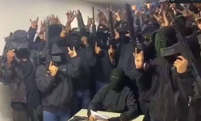 En el video de casi un minuto, el vocero que explica lo sucedido está en una mesa sentado, mientras que el resto de sus compañeros lo escoltan, encapuchados, vestidos de negro y sosteniendo armas de grueso calibre.