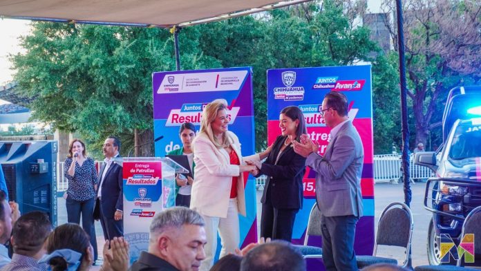 “A nombre de mis compañeros alcaldes y alcaldesas del estado, le damos las gracias y le refrendamos nuestro apoyo para seguir trabajando juntos”, así agradeció la alcaldesa de Meoqui Miriam Soto a la Gobernadora Maru Campos, al recibir una nueva unidad para la corporación de Seguridad Pública Municipal, sumando un total de tres nuevas unidades de patrullaje.