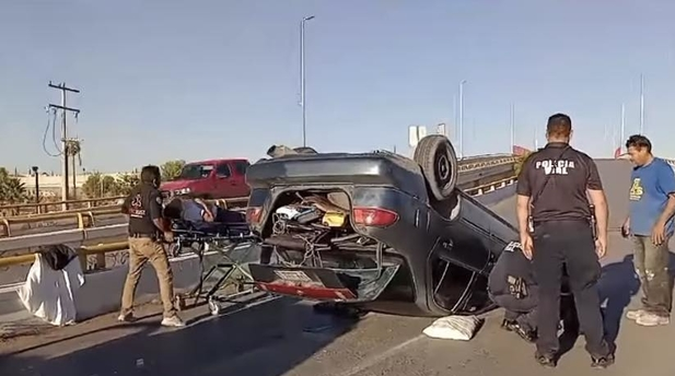 Esto, sucedió cuando las dos mujeres de entre 40 a 45 años se dirigían a uno de los centros médicos y al tratar de subir el puente de oriente a poniente perdieron el control e impactaron el muro de contención para terminar volcando, quedando llantas hacia arriba.