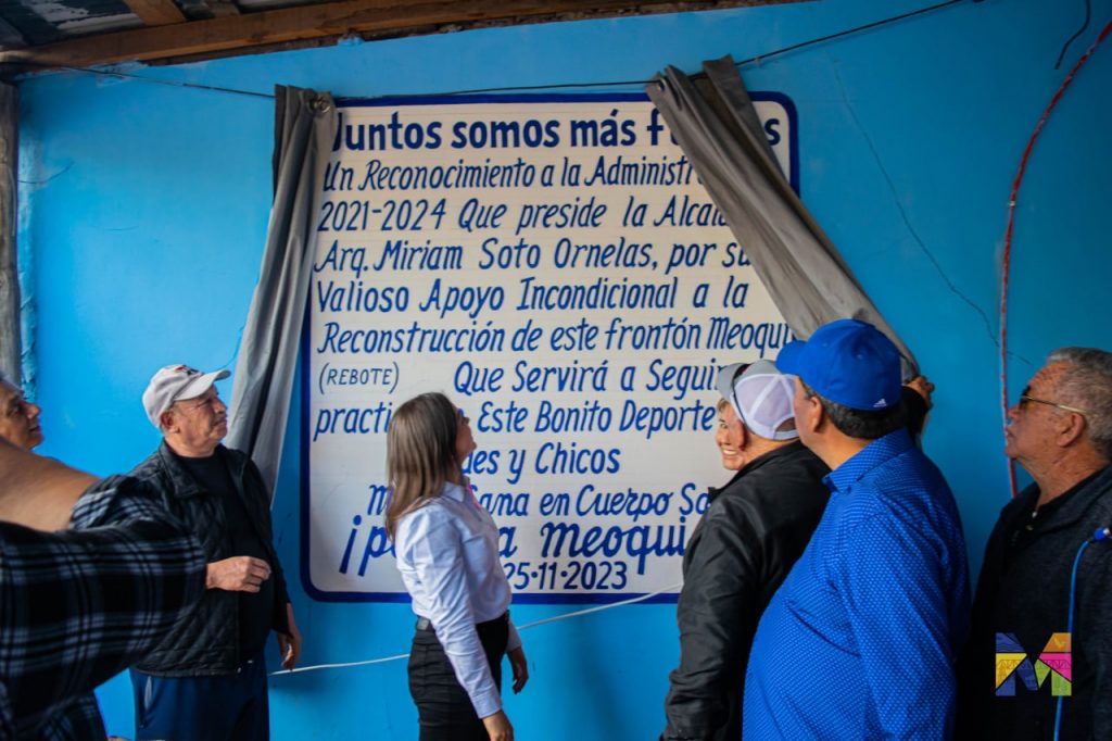 Ciudadanía y Gobierno Municipal de Meoqui suman esfuerzos para rescatar este deporte tradicional“Un reconocimiento a la administración que preside la alcaldesa Miriam Soto por su apoyo valioso e incondicional en la reconstrucción de este Frontón Meoqui, que servirá para seguir practicando este bonito deporte, por amor a Meoqui, gracias presidenta”, dijo Arturo Martínez, integrante del Comité de Rebote de Meoqui, quienes inauguraron la obra de rehabilitación de muro de cancha en conjunto con la alcaldesa Miriam Soto.