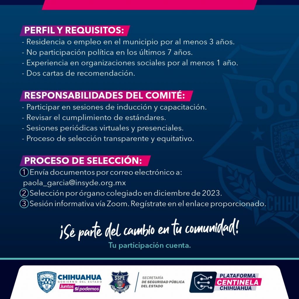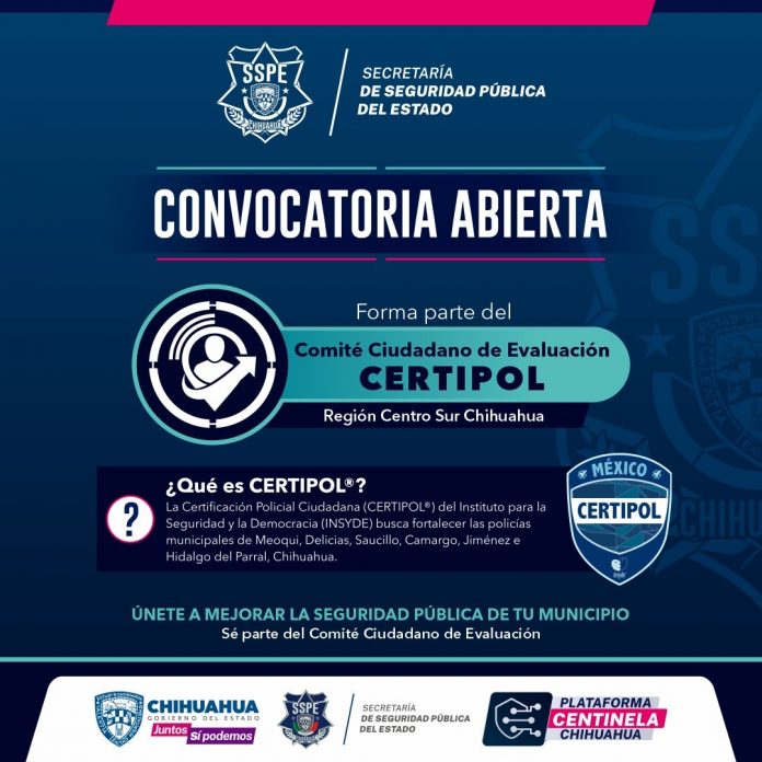 La Secretaría de Seguridad Pública del Estado, en coordinación con FICOSEC y el Instituto para la Seguridad y la Democracia (INSYDE) invita a la ciudadanía a participar en la convocatoria para candidatas y candidatos interesados en formar parte del Comité Ciudadano de Evaluación, en el marco del proceso de Certificación Policial Ciudadana (CERTIPOL®) de las policías municipales de Meoqui, Delicias, Saucillo, Camargo, Jiménez e Hidalgo del Parral, Chihuahua.