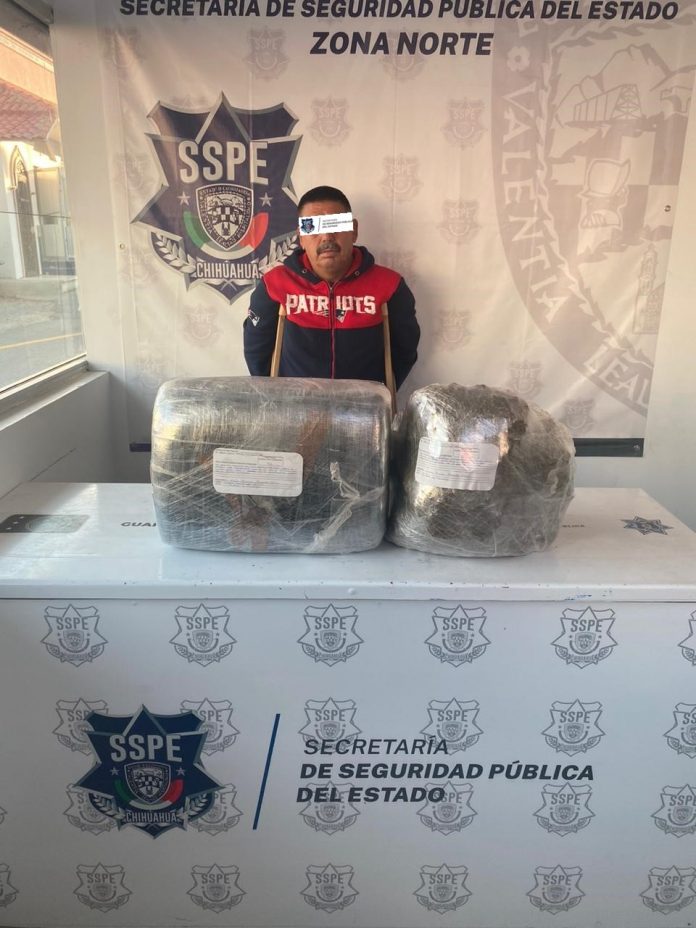 Elementos de la Policía Estatal de la SSPE, lograron la aprehensión de un hombre por delitos contra la salud en Ciudad Juárez. El detenido fue identificado como Efren Rodolfo A. F. De 52 años, quien portaba consigo 2 paquetes de droga con las características propias de la marihuana, mismos que le fueron asegurados por el personal operativo.