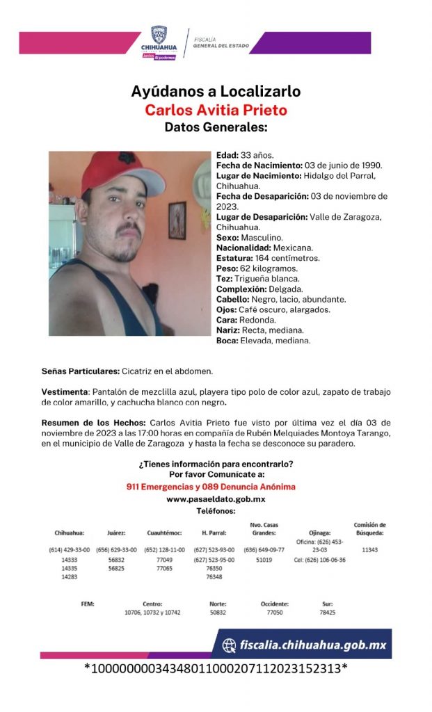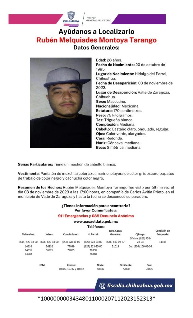 En caso de contar con información que ayude a localizar a Rubén Melquiades Montoya Tarango y Carlos Avitia Prieto, comunicarse al Sistema de Emergencia 9-1-1 o a través del número 098 de denuncia anónima.