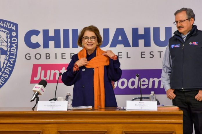 La presidenta del DIF Estatal, María Eugenia Galván Antillón, acompañada del director del DIF, Gabriel Eguiarte y del secretario de Pueblos y Comunidades Indígenas (SPyCI), Enrique Rascón Carrillo, informaron en rueda de prensa sobre esta primera etapa de entrega de paquetes alimenticios que se distribuyeron como parte del programa emergente por la sequía.