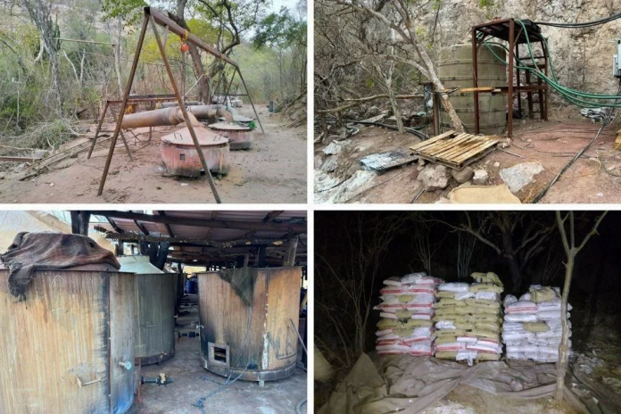 “Fueron asegurados más de 300 tambos con capacidad de 200 litros con líquidos, además de sustancias en sacos y cajas, tanques de gas estacionario, costales de 25 kilogramos cada uno, que contenían diversas sustancias. Asimismo, se aseguraron plantas industriales de energía eléctrica, depósitos de agua con mangueras conectadas, una retroexcavadora, una pipa de gas natural y varios hornos de gas, entre otros”, se detalló en el comunicado emitido por la Fiscalía General de la República (FGR).