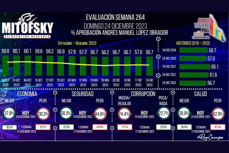 Para la evaluación de la semana 264, la aprobación del presidente López Obrador sigue estancada en 56.7%, cifra similar a la que se reportó desde inicio de noviembre con 57.9% y la más baja comparada con el mismo mes de otros años.