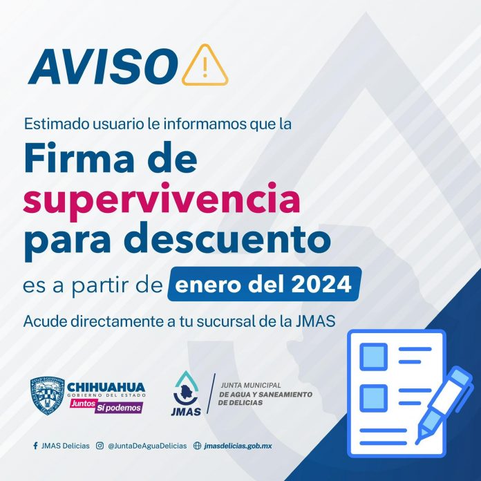 La Junta Municipal de Agua y Saneamiento (JMAS) de Delicias, informa a la comunidad que a partir del 15 de enero, estará abierta la firma de supervivencia para acceder al beneficio del 50 por ciento de descuento en el pago del servicio de agua potable, específicamente sobre el consumo de los primeros 20 metros cúbicos de recurso hídrico.