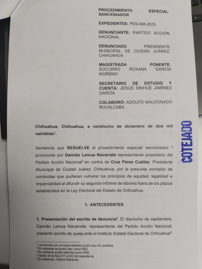 “… Al encontrarse acreditada la infracción consistente en la difusión extemporánea del informe de labores del presidente… La celebración extemporánea del informe labores, como resultado de la responsabilidad en la comisión de la referida infracción que ha quedado acreditada a través de esta resolución, se puede leer en el contenido de la notificación que signan los magistrados, Roxana García Moreno, Hugo Molina Martínez y Gabriel Sepúlveda Ramírez.El 9 de septiembre el edil juarense presentó formalmente ante el Cabildo del Ayuntamiento de Ciudad Juárez su informe; sin embargo, presentó otro de manera pública el 17 de septiembre, con ocho días transcurridos.