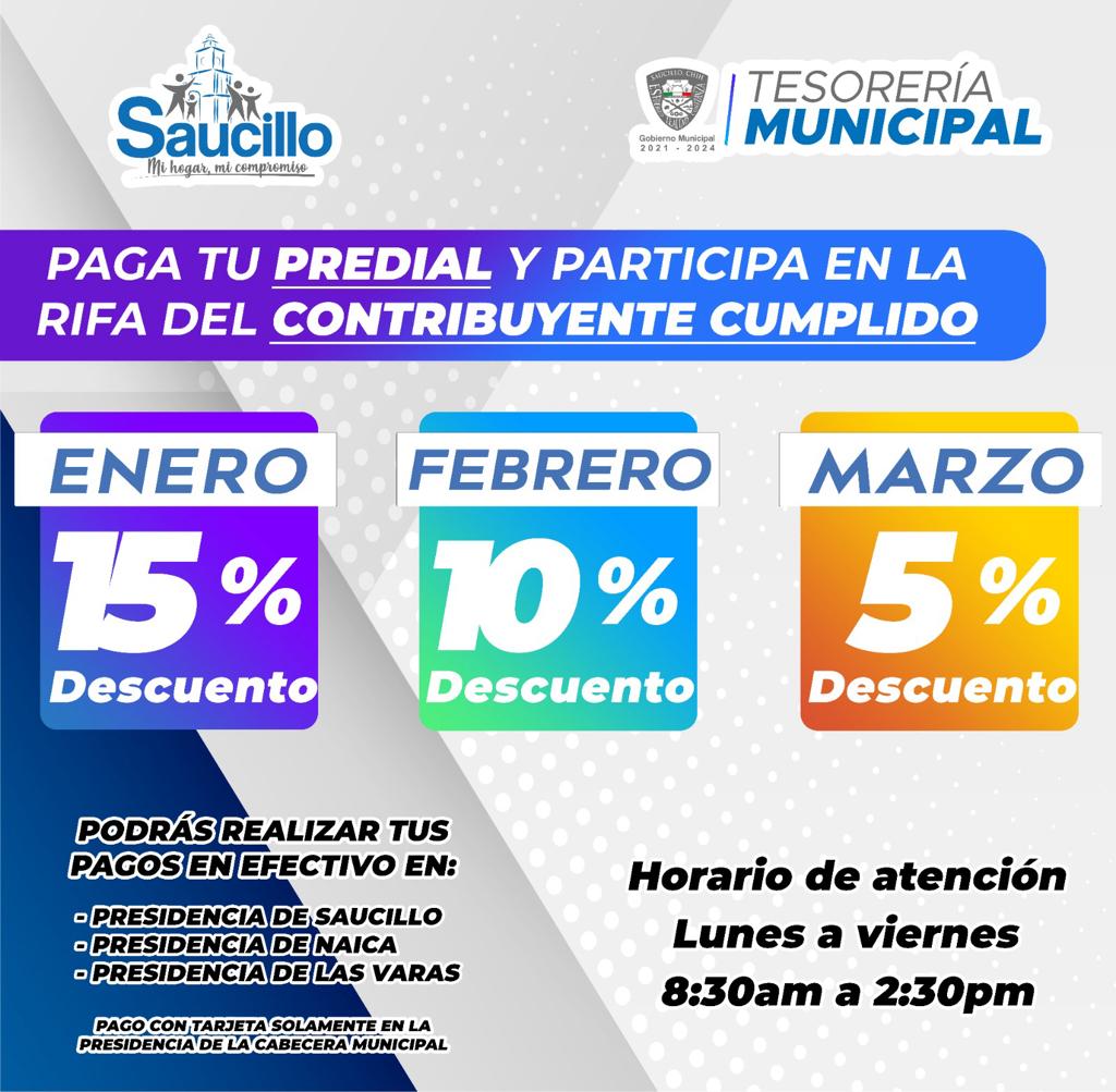 La alcaldesa destaca la importancia de cumplir con el pago del predial para fortalecer los recursos destinados a servicios esenciales como educación, salud, seguridad y obras públicas. El impuesto predial es una inversión en el progreso de nuestro Saucillo. Con estos recursos, podemos seguir construyendo un municipio más próspero y mejorar la calidad de vida de todos los ciudadanos, expresó López De Anda.La invitación queda abierta para que la ciudadanía acuda a los puntos de recaudación designados y aproveche el descuento disponible durante el mes de enero, contribuyendo así al desarrollo sostenible y al bienestar común de Saucillo.