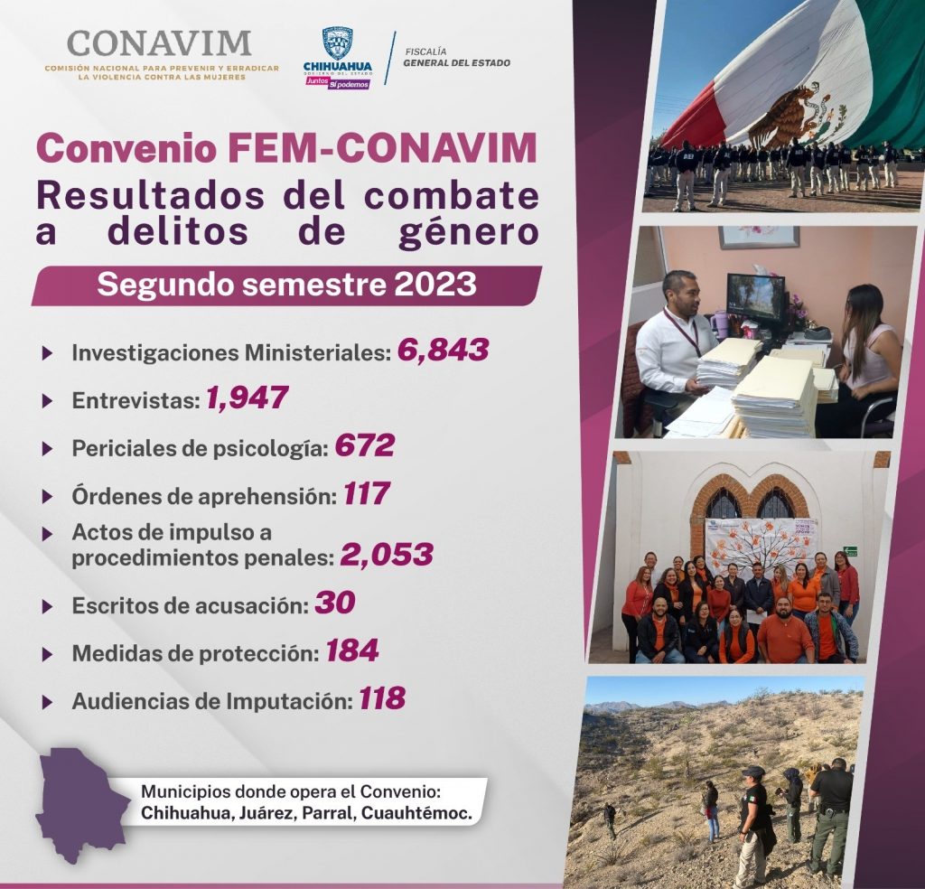 La Fiscalía Especializada en Atención a Mujeres Víctimas del Delito por Razones de Género y a la Familia (FEM), obtuvo resultados positivos en las acciones efectuadas durante el segundo semestre de 2023, en los municipios de Chihuahua, Juárez, Parral y Cuauhtémoc, que cuentan con declaratoria de alerta de violencia de género.