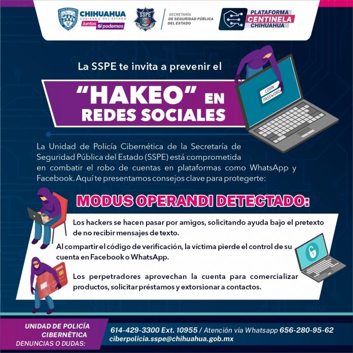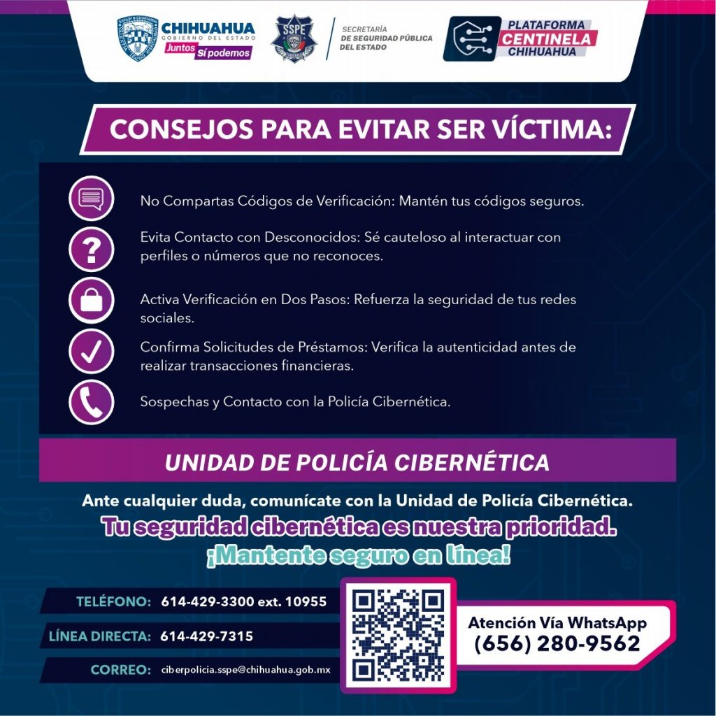 Recuerda, la Policía Cibernética está a tu disposición para brindarte asistencia. Para cualquier duda o mayor información, comunícate al 614-429-3300, extensión 10955, a la línea directa 614-429-7315, a través de WhatsApp al 656-280-9562 o por correo electrónico a ciberpolicia.sspe@chihuahua.gob.mx.