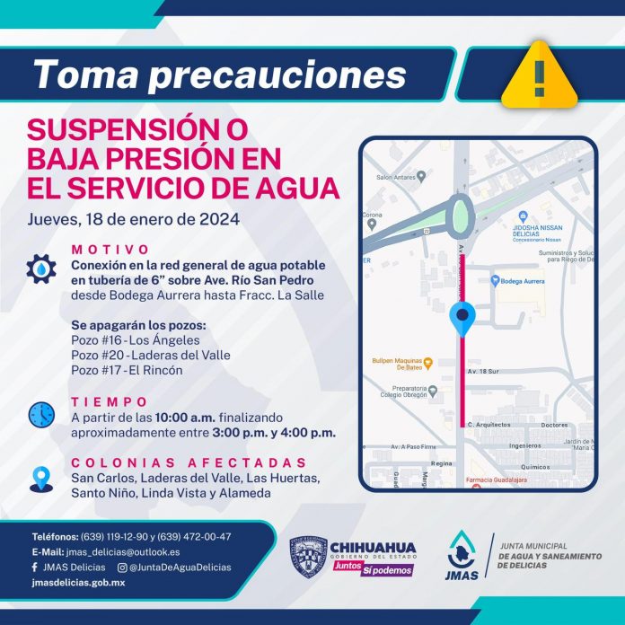 La Junta Municipal de Agua y Saneamiento de Delicias, informa a la ciudadanía sobre una interrupción programada en el suministro de agua potable debido a trabajos de conexión en la red general. Estas labores, que involucran la instalación de tubería de 6 pulgadas, se llevarán a cabo en la avenida Río San Pedro, específicamente a la altura del fraccionamiento La Salle.