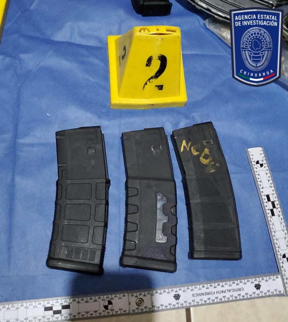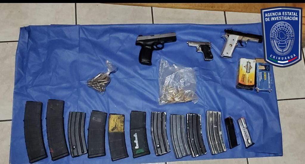 Elementos de la Agencia Estatal de Investigación ejecutaron una orden de cateo en un domicilio de la colonia Infonavit Nacional de la ciudad de Chihuahua, en donde aseguraron 14 cargadores, 167 cartuchos cuatro armas de fuego, un vehículo y una porción de la droga conocida como cristal.