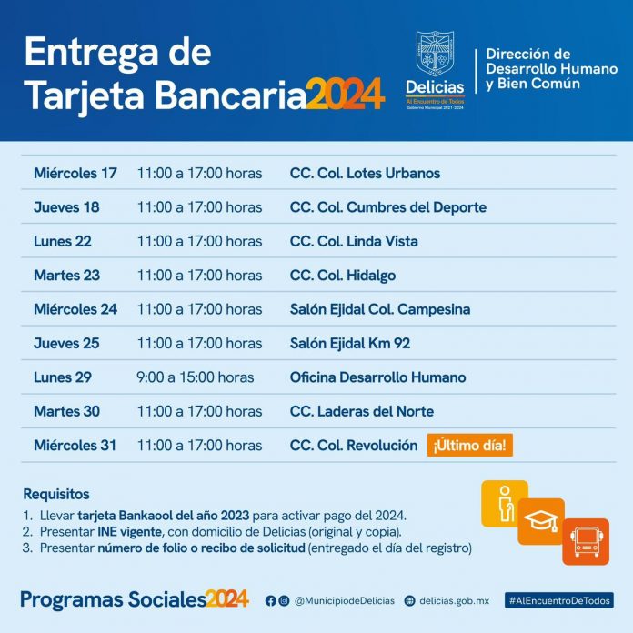 Dan a conocer Calendario para Entrega de tarjetas de programas sociales en colonias de Delicias