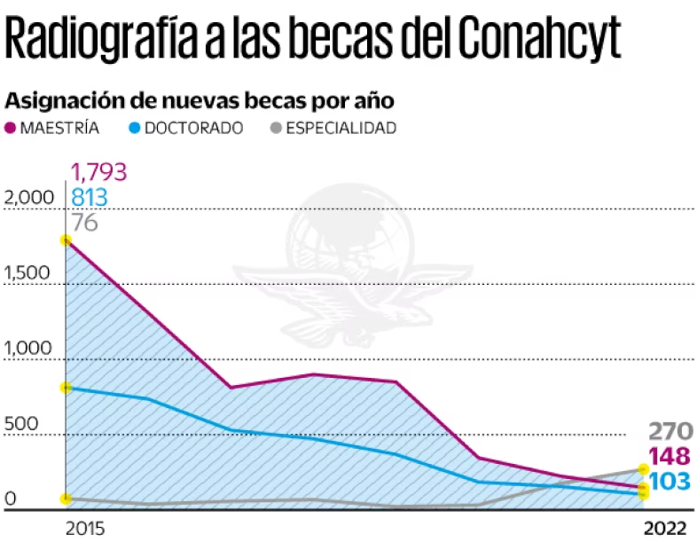 Las becas para maestría bajaron de 1793, en 2015, a sólo 148 en 2022. Las becas para el doctorado cayeron de 813 a solo 103 en el mismo periodo. Lo único que ha aumentado son las becas a Cuba, que son para especialidades médicas.