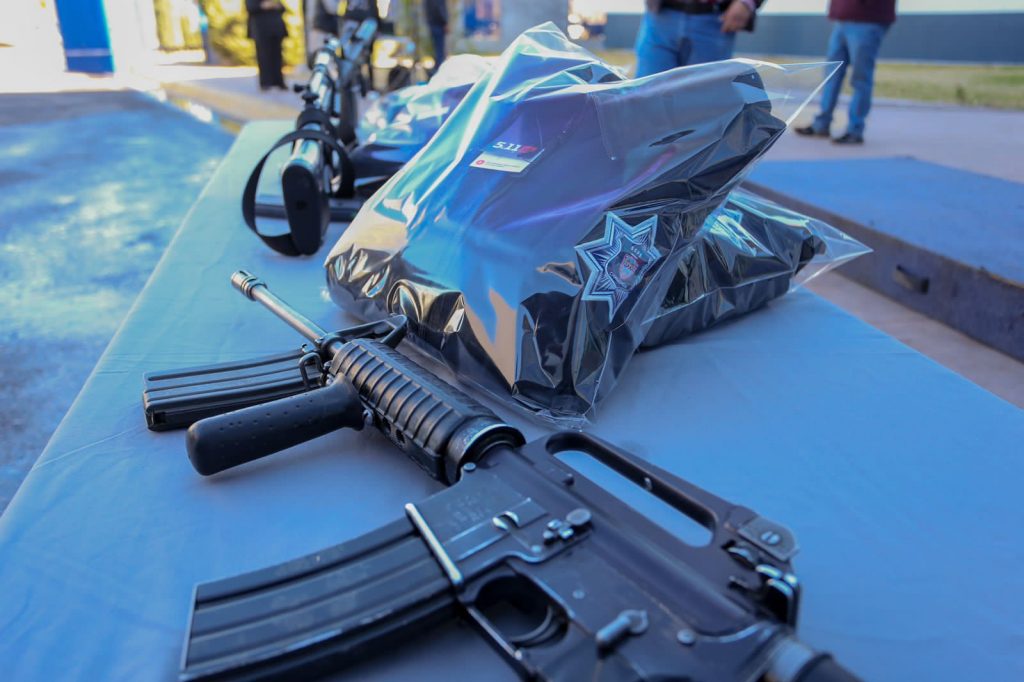 Como resultado de las gestiones realizadas con el Secretario de Seguridad Pública Estatal, esta mañana el Alcalde Jesús Valenciano, en compañia del Director de Seguridad Pública Municipal, el Comandante Jorge Luis Bustamante, la Sindica Municipal, Gabriela Peña Orta, el Diputado Local, Roberto Carreón y Regidores del Ayuntamiento, se realizó la entrega de 238 chamarras, así como armamento que consiste en 34 fusil automático ligero, 18 buch master calibre 5.56 y 12colt AR15, “el que sigamos saliendo como la corporación de seguridad pública con mayor percepción en el estado, eso implica además de la capacitación constante que ustedes tienen, eso implica cumplir con todas las normas y todos los lineamientos”.