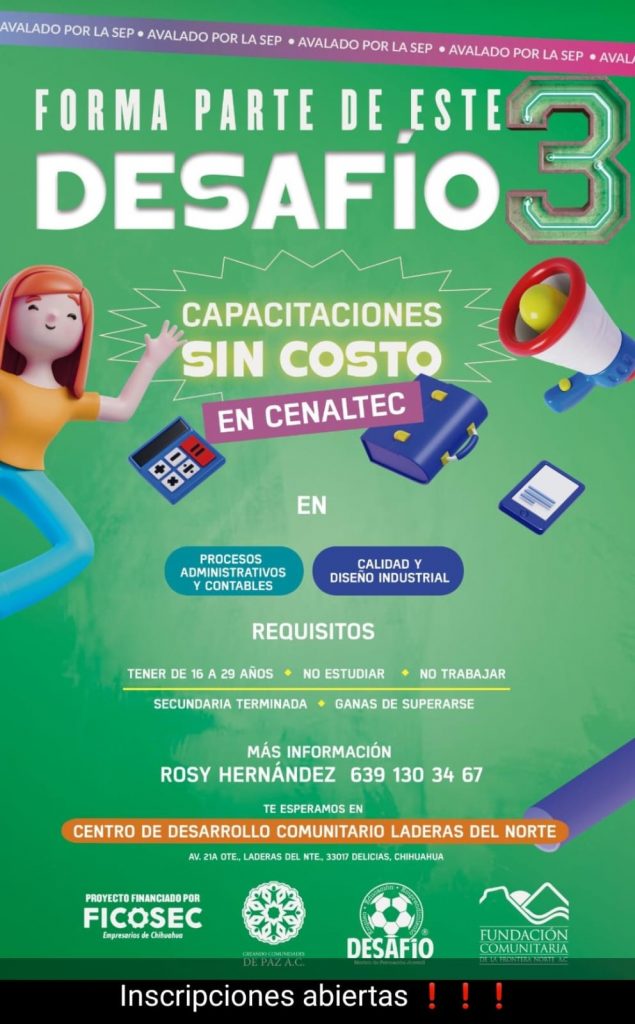 Destinado a jóvenes de 16 a 29 años “Desafio” es un programa que brinda capacitaciones para el trabajo avaladas por la SEP de forma gratuita además de brindar beneficios como bolsa de trabajo y proyecto emprendedor, así mismo durante los 6 meses de capacitación se les brinda apoyo psicológico y deportivo.