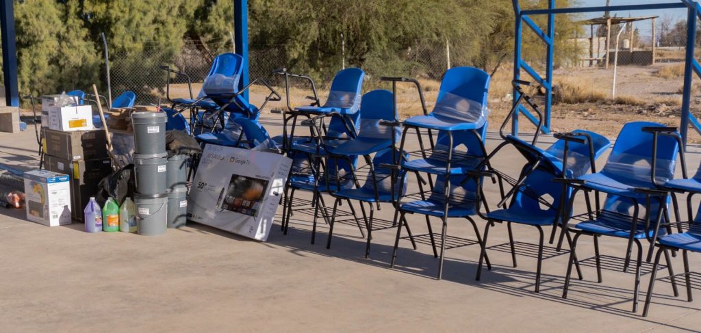 En este evento se realizó la entrega de 3 computadoras, 4 multifuncionales, un minisplit, 46 butacas, 3 proyectores, una televisión, una mesa de trabajo, equipo deportivo, material de oficina, 11 cubetas de pintura, kit de limpieza y dos pizarrones, mismos que serán para beneficio de los tres Telebachilleratos del municipio.