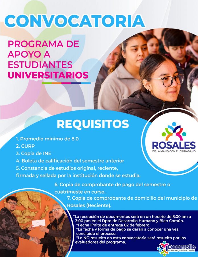 ROSALES.– Por parte de la Dirección de Desarrollo Humano y Bien Común del municipio de Rosales se informó que por tercera vez se pone en marcha la convocatoria del Programa de Apoyo a Estudiantes Universitarios, dicha convocatoria estará abierta del 22 de enero al 2 de febrero del año en curso.