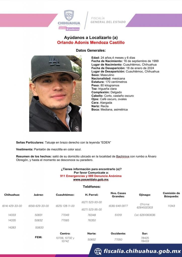La Fiscalía solicita a la ciudadanía que cuente con información que pueda llevar a la localización de Orlando Adonis Mendoza Castillo, favor de reportarla a través de la línea de Emergencias 911 o bien en el número 089 de Denuncia Anónima.