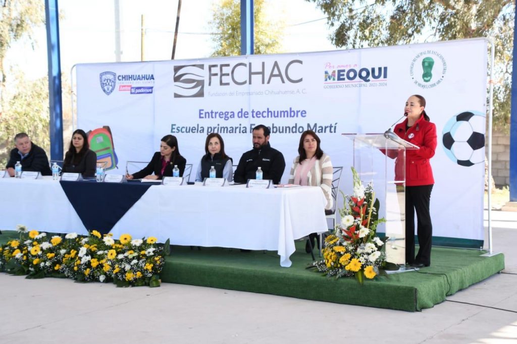 “La techumbre que hoy inauguramos es más que una estructura física, representa el compromiso y la colaboración de todas y todos con la educación del municipio de Meoqui, gracias a la generosidad y solidaridad, hoy cuentan con un espacio seguro y adecuado para el desarrollo de las actividades escolares, que beneficiará no sólo a las alumnas y alumnos, sino a toda la comunidad educativa”, expresó.