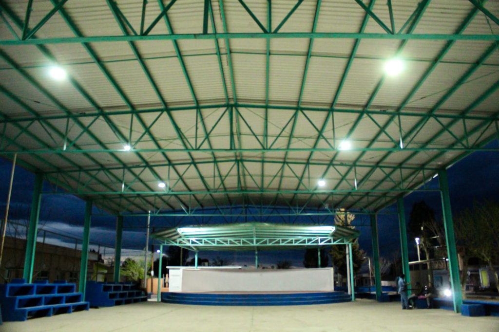 Y por último se realizó la rehabilitación de la plaza principal y la cancha en la comunidad, dónde se realizó el suministro y colocación de 8 lámparas tipo campana, 4 lámparas punta y poste de 100 watts, 2 reflectores de 50 watts, 2 reflectores de 150 watts y más de 400 metros lineales de cableado, con tubo conduit y accesorios.