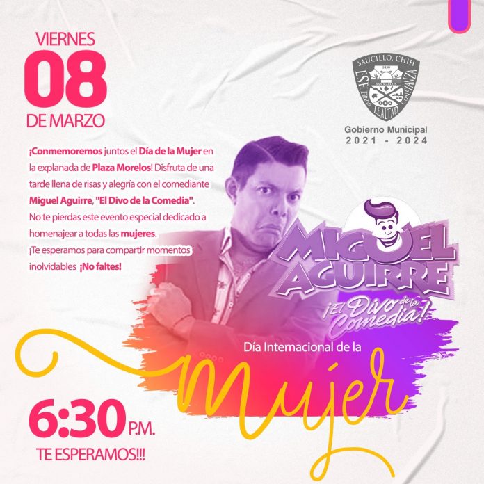 El Gobierno Municipal de Saucillo se complace en invitar a toda la comunidad a sumarse a la conmemoración del Día Internacional de la Mujer en un evento especial que se llevará a cabo en la Plaza Morelos este viernes 8 de marzo a las 6:30 pm. La destacada velada contará con la presentación del reconocido comediante Miguel Aguirre, conocido como “El Divo de la Comedia”.