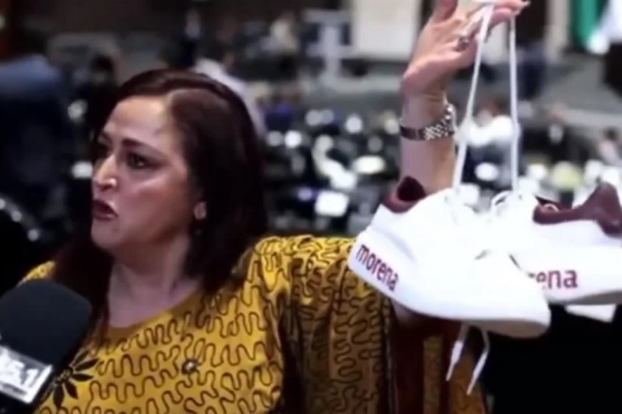Al tirar los tenis de Morena, la diputada Susana Prieto llamó a los trabajadores a castigar a los partidos políticos si no aprueban la reforma de reducción de la jornada laboral.