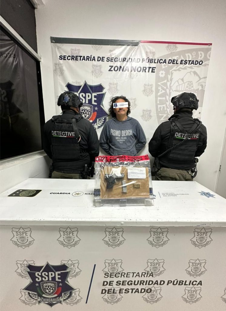 En Urbi Villa del Prado Etapa II, los elementos de seguridad arrestaron a Juan Francisco R. P., de 46 años, quien portaba un arma de fuego con un cargador con 5 cartuchos útiles calibre .380.