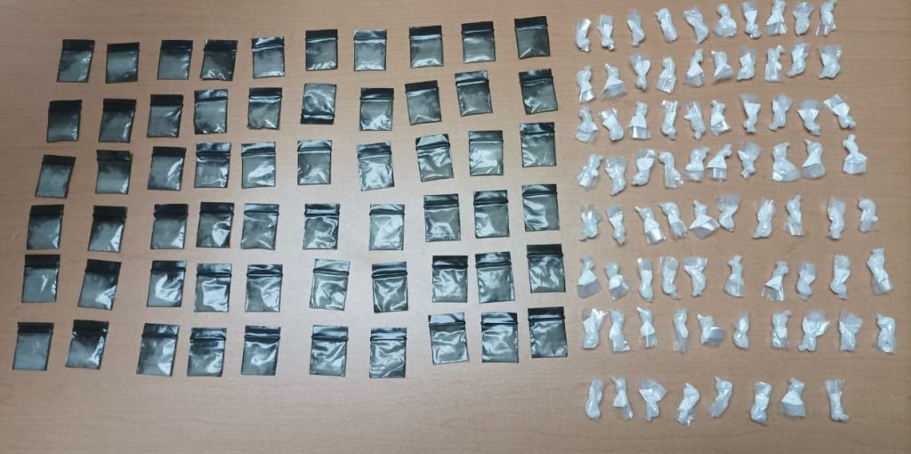 De los automóviles Dodge Neon color negro y Dodge Attitud color blanco, descendieron los masculinos, a quienes tras la revisión se les localizó un arma de fuego del tipo pistola, calibre .40, la cantidad de 2 mil 150 pesos y 143 porciones de una sustancia con las características similares a las de la cocaína en estado sólido.