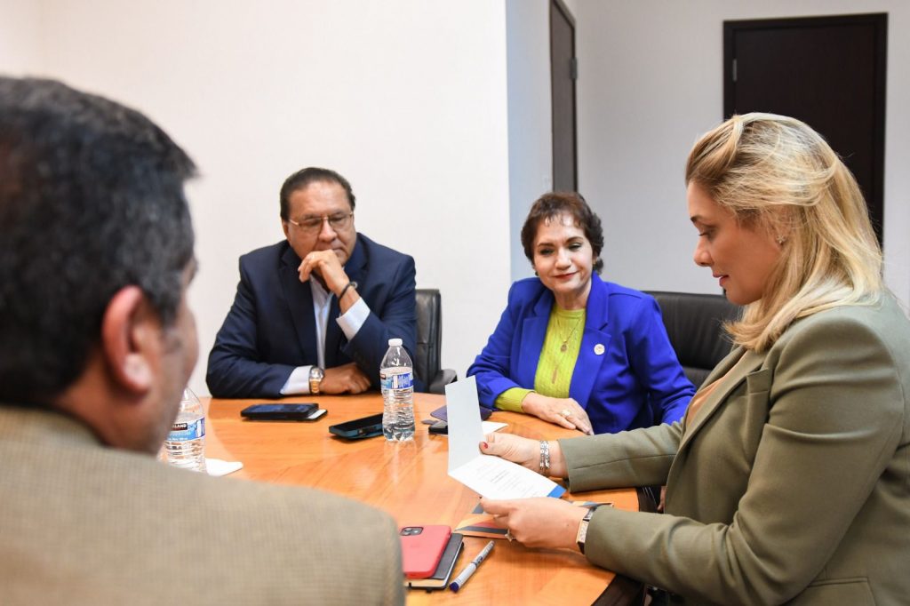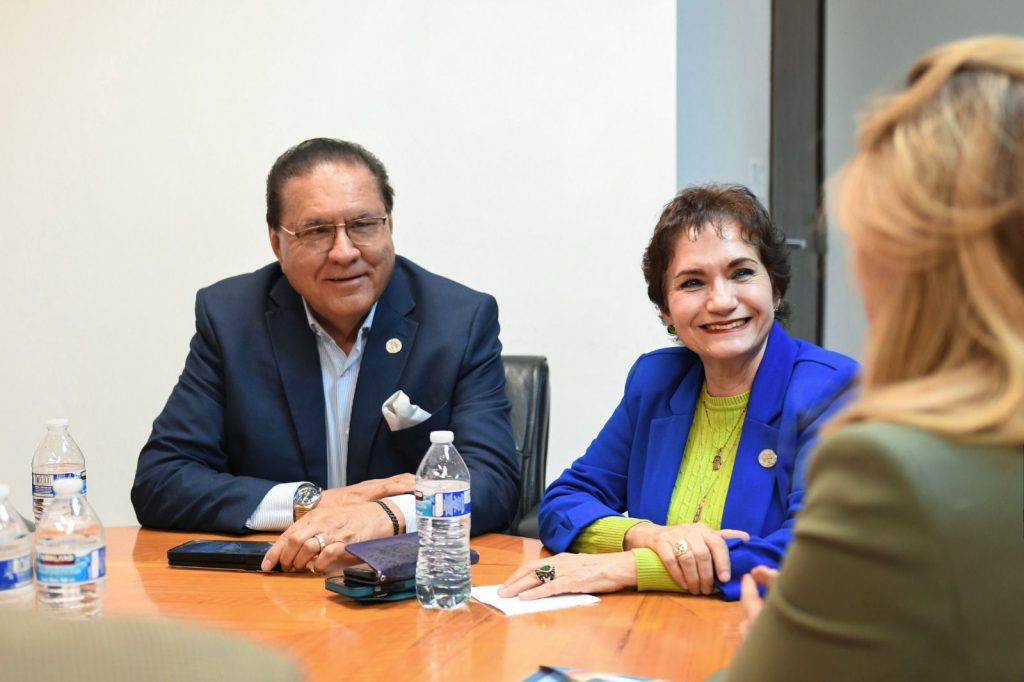 La Gobernadora del Estado recibió en las oficinas de El Pueblito Mexicano, en Ciudad Juárez, a la nueva mesa directiva de la Cámara Nacional de Comercio (Canaco), que es presidida por la empresaria Elizabeth Villalobos.