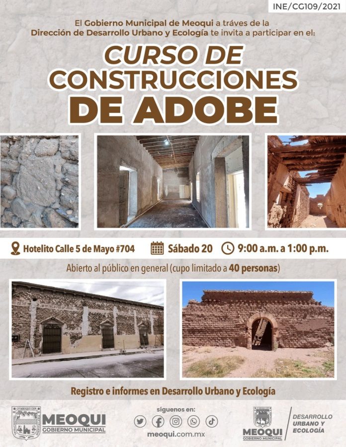 La dirección de Desarrollo Urbano y Ecología del Gobierno Municipal de Meoqui extiende la invitación a toda la ciudadanía al curso de Construcción de Adobe, el cual se estará llevando a cabo este sábado 20 de abril, de 9 am a 1 pm en “El Hotelito”.