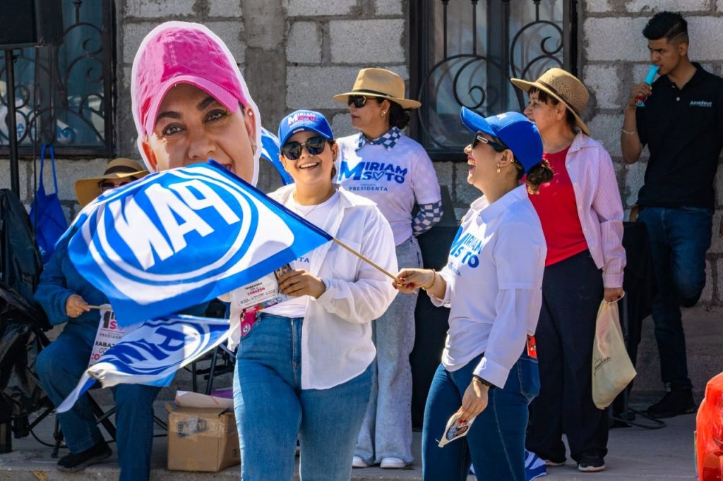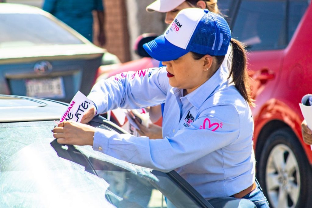 Al ritmo de la música, las banderas, el sonido de los claxons y un gran ambiente, la ciudadanía mostró su apoyo a la Arquitecta Miriam Soto, candidata a la Presidencia Municipal de Meoqui en el crucero realizado en las Calles Degollado y Doblado con la pega de calcas y micro perforados.