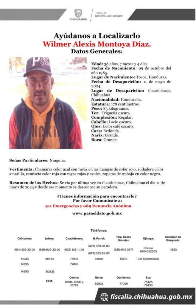 El reporte interpuesto por sus familiares, establece que el pasado viernes 10 de mayo, llegaron al municipio de Cuauhtémoc, las personas de nombres, Wilmer Alexis Montoya Díaz, de 38 años de edad, Edgar Daniel Manzano Borjas, de 17 años, y Hugo René Deras Pacheco, de 39 años de edad, en su travesía hacia los Estados Unidos.