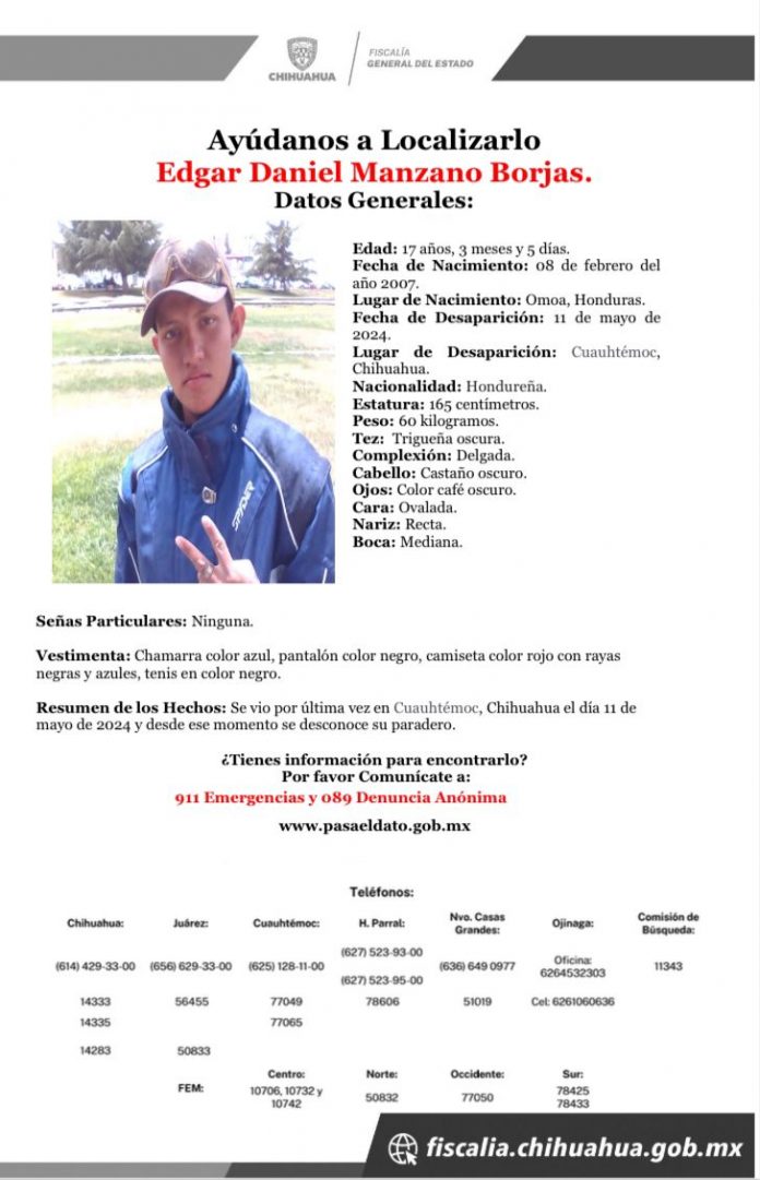 La Fiscalía de Distrito Zona Occidente, solicita la colaboración de la comunidad para localizar a tres masculinos de nacionalidad hondureña, que ayer domingo fueron reportados como desaparecidos en la ciudad de Cuauhtémoc.