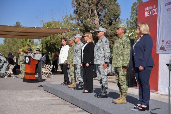 La Gobernadora del Estado estuvo presente esta mañana en la ceremonia de toma de posesión al mando y protesta de bandera, del comisario jefe Fernando Colchado Gómez, como nuevo coordinador estatal de la Guardia Nacional en Chihuahua.