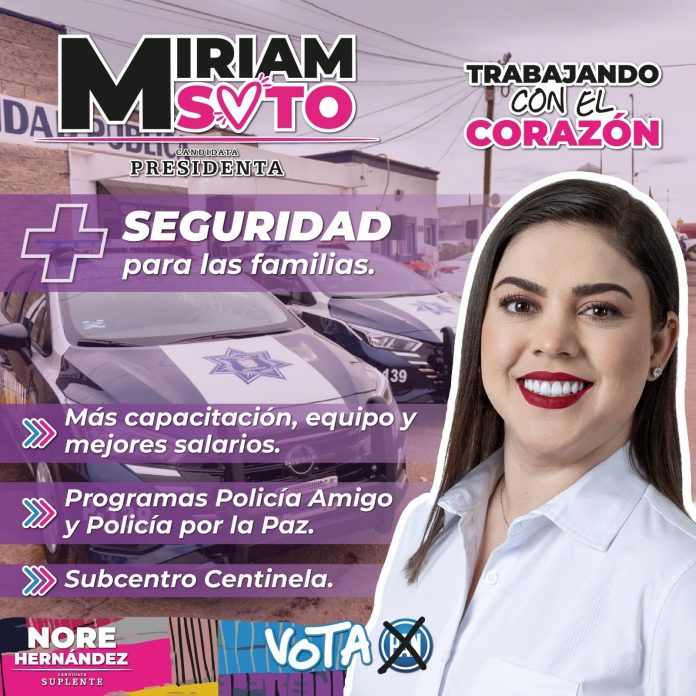 “La seguridad de las familias seguirá siendo una prioridad, le hemos entrado con todo a la capacitación de nuestros elementos, mejorando sus condiciones de trabajo con uniformes, nuevas unidades, mejorando sus salarios, realizando ese acercamiento de la corporación con la ciudadanía, implementando más de 70 grupos de WhatsApp Vecino Vigilante, pero también, realizando las gestiones necesarias, con lo cual, estamos a punto de tener una policía certificada y próximamente seremos sub centro centinela” así lo dijo la Arq. Miriam Soto, quien busca seguir Trabajando con el Corazón por Meoqui como candidata común PAN, PRI y PRD.