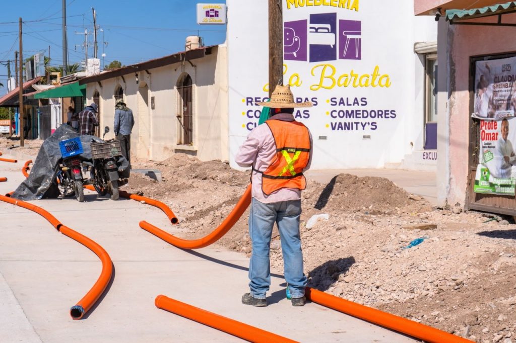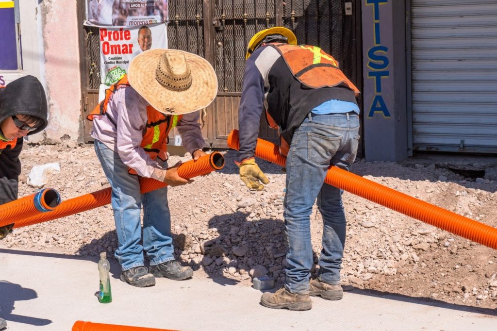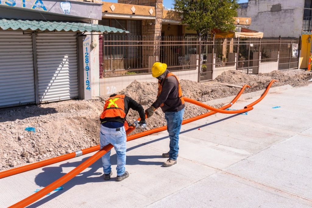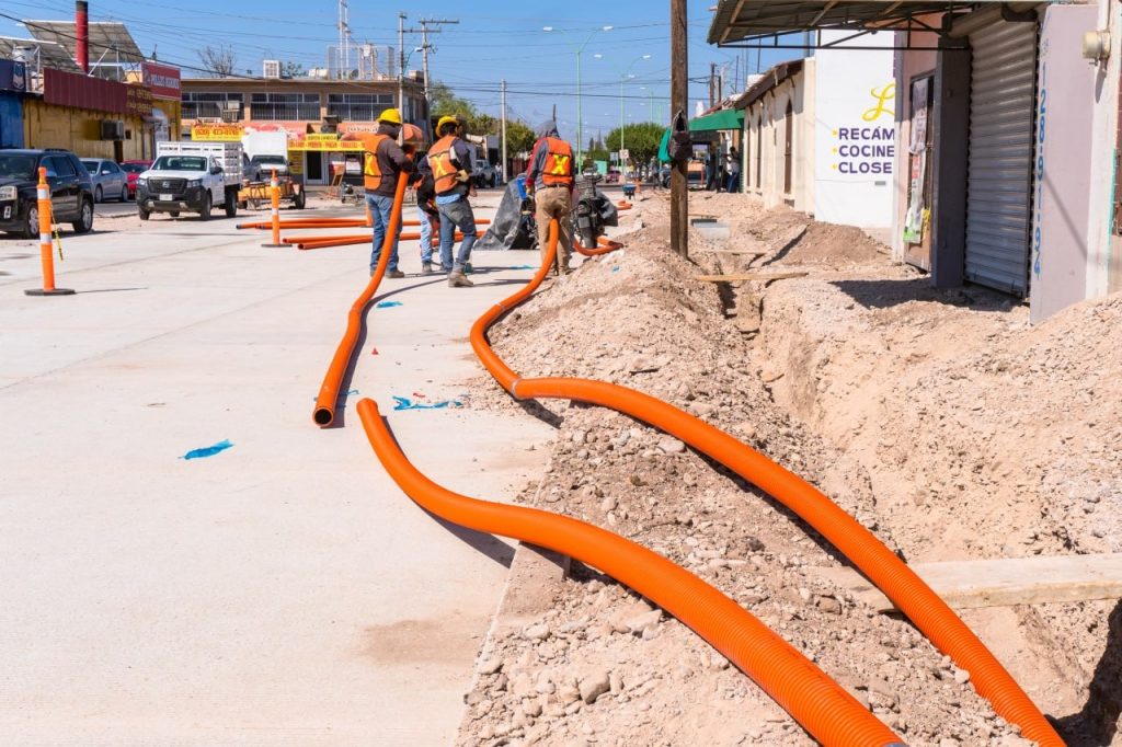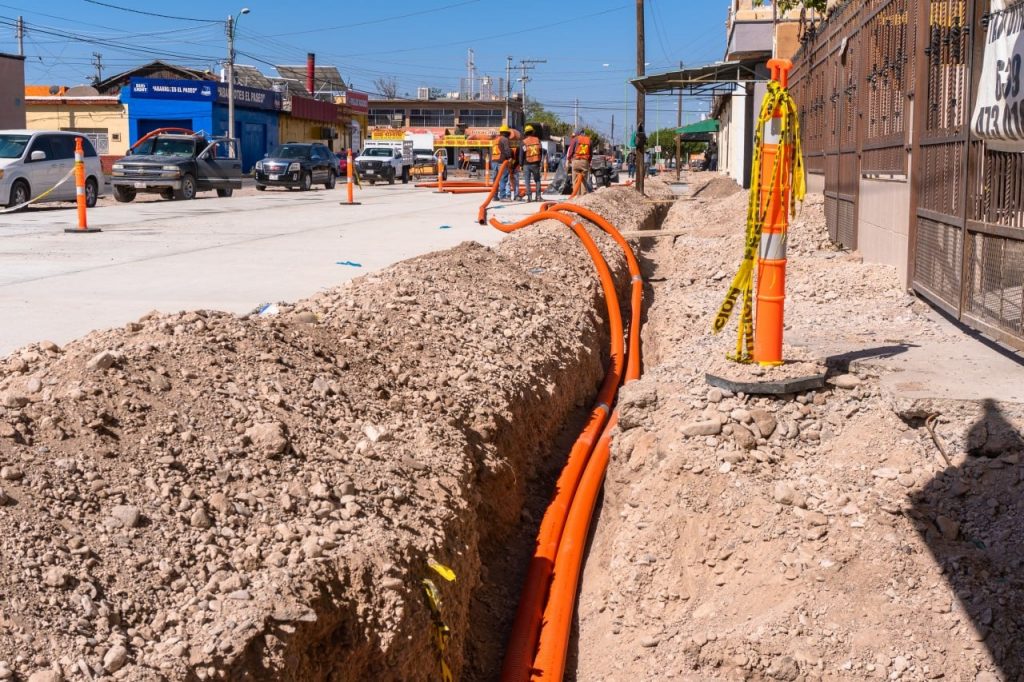 Continúan los trabajos dentro de la Rehabilitación del Paseo Zaragoza en el municipio de Meoqui en donde se encuentran realizando la habilitación de zanjas e instalación de la tubería para los registros y cableado subterráneo de CFE y las empresas de telecomunicaciones IZZI y Telmex.