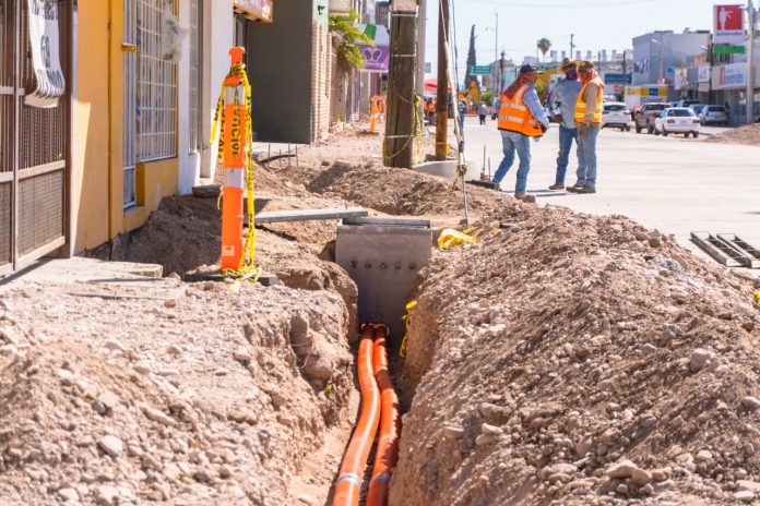 Continúan los trabajos dentro de la Rehabilitación del Paseo Zaragoza en el municipio de Meoqui en donde se encuentran realizando la habilitación de zanjas e instalación de la tubería para los registros y cableado subterráneo de CFE y las empresas de telecomunicaciones IZZI y Telmex.
