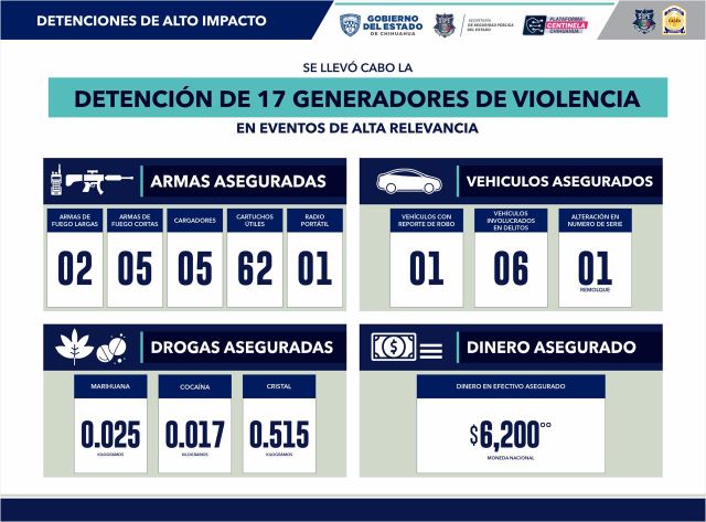 El secretario de Seguridad Estatal, Gilberto Loya, aseguró que mediante diversos operativo, se logró la detención de 17 generadores de violencia, a quienes se les decomisó 2 armas largas, 5 cortas, mismo número de cargadores, 62 cartuchos otiles y 1 radio portátil