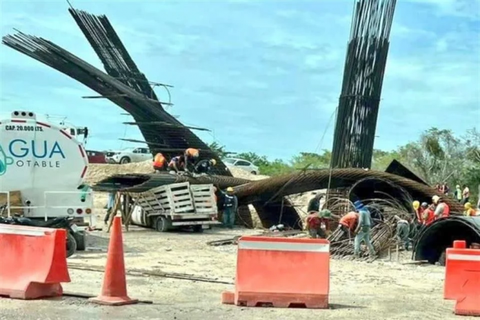 En las obras de construcción del Tramo 7 del Tren Maya colapsaron las columnas de varilla que eran levantadas para soportar un puente en Chetumal, Quintana Roo.