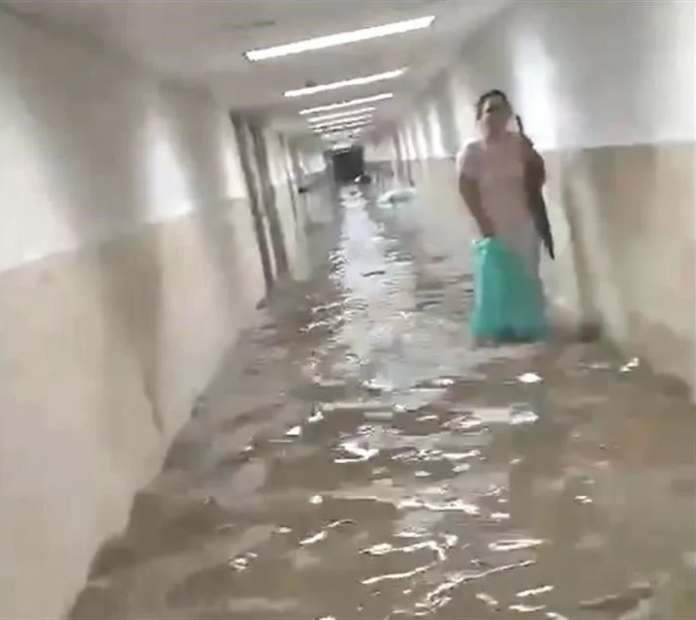 “Así se vive una noche de agua aquí en nuestro queridísimo hospital”, dice un empleado del nosocomio en un video subido a redes sociales.