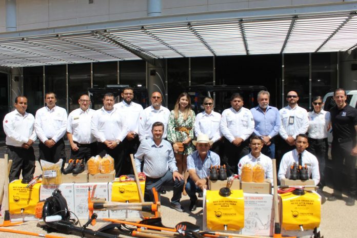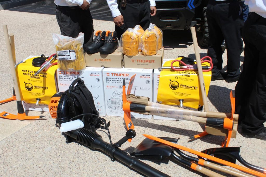 Esta donación es la primera de tres programadas y consistió en la dispersión de instrumentos que incluyen botas especiales para el combate de incendios, sopladoras de gasolina, palas, picos, mochilas aspersoras y rastrillos forestales.