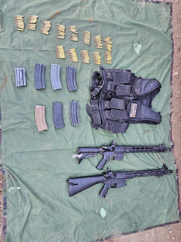 Tras la revisión se les aseguraron 2 armas largas de las marcas Anderson y Ke-Arms, 7 cargadores funcionales, así como 130 cartuchos útiles calibre 5.56 x 45 mm, además de un chaleco antibalas, razón por la que formalmente se les detuvo.