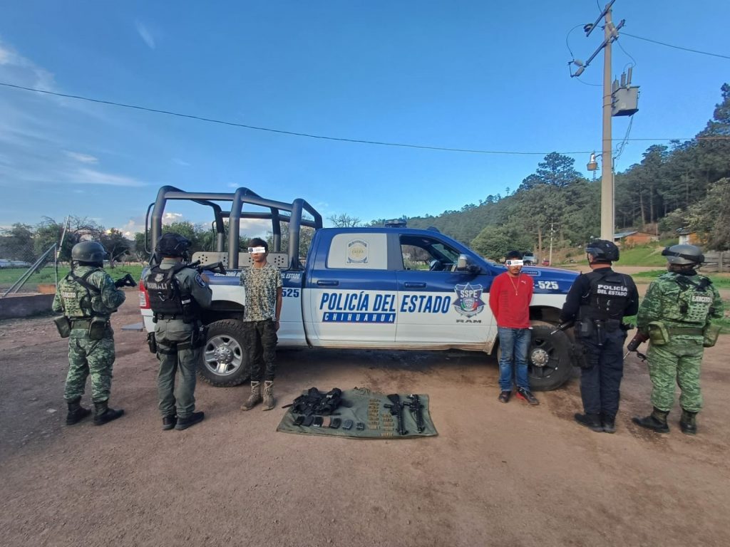 Elementos de la Secretaría de Seguridad Pública del Estado (SPPE), llevaron a cabo la detención de 2 sujetos en el municipio de Madera, identificados como Ramón Alexis A. C. y Felix Alejandro J. O., quienes portaban consigo armas largas de fuego y equipo táctico.