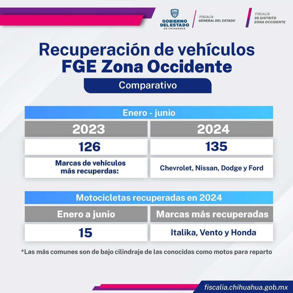 En cuanto a motocicletas, en el 2024 se han recuperado 15 unidades, en el lapso de enero a junio, en tanto que, en el mismo periodo, pero del año 2023, se lograron localizar 07 motos, siendo las más comunes las de menor cilindraje o las conocidas como unidades para reparto.