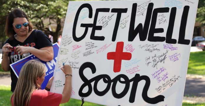 Alexandra Schwatge colocan un cartel gigante con el rostro del republicano y colocó un cuadro mural en el que los simpatizantes escribían mensajes y deseos para Trump: “Eres nuestro héroe”, “Recupérate pronto”, “¡lucha, lucha, lucha!”, son algunas de las frases que podían leerse.