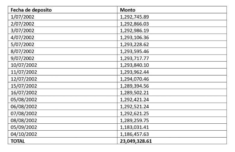 CIUDAD DE MÉXICO (Proceso).- En 18 días, entre julio y septiembre de 2002, Cinthia Aideé Chavira Gamboa recibió depósitos por cantidades cercanas a un millón 300 mil pesos solamente con diferencia de 120 pesos aproximadamente. En total, a la cuenta de la esposa del exgobernador Javier Corral ingresaron 23 millones 49 mil 328 pesos y 61 centavos.