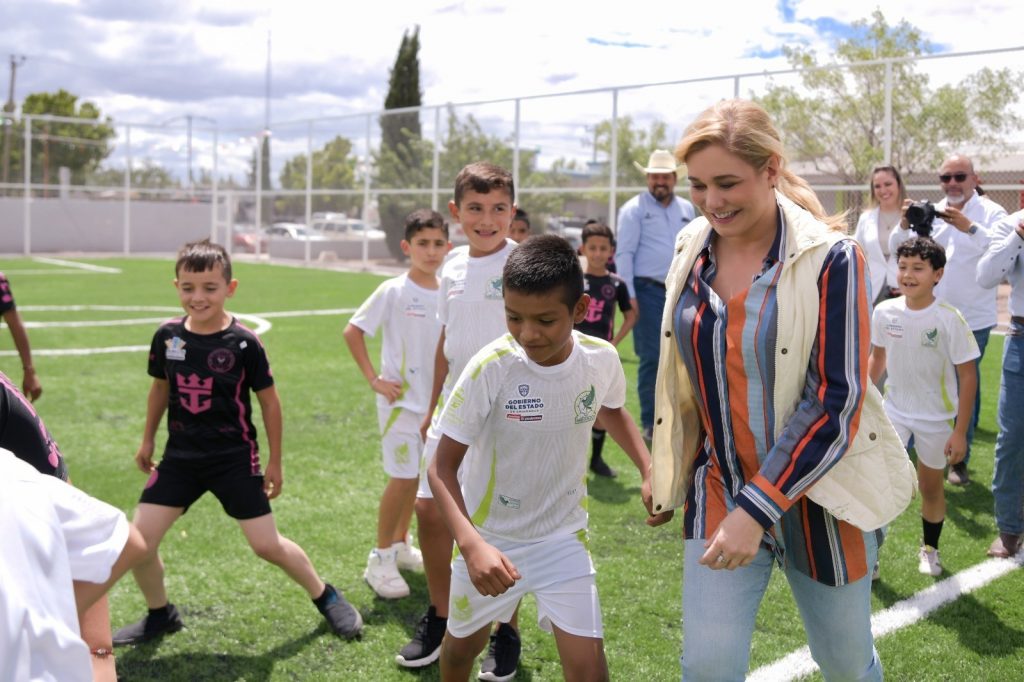 En Janos, con una “cascarita” la mandataria inauguró una cancha de futbol 7×7 con pasto sintético en la escuela Porfirio Talamantes, donde además distribuyó mobiliario educativo para otros 10 planteles, como butacas, pizarrones, aires, tinacos y luminarias.